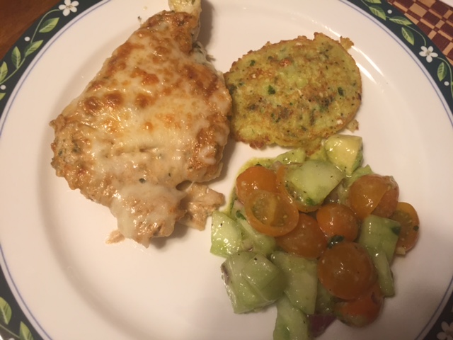 Fiesta Lime Chicken, Zucchini Cake with Feta & Green onion and Cucumber ,Tomato & Avocado salad